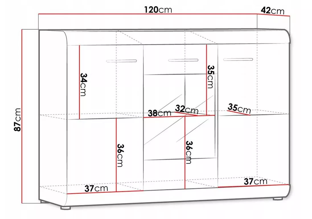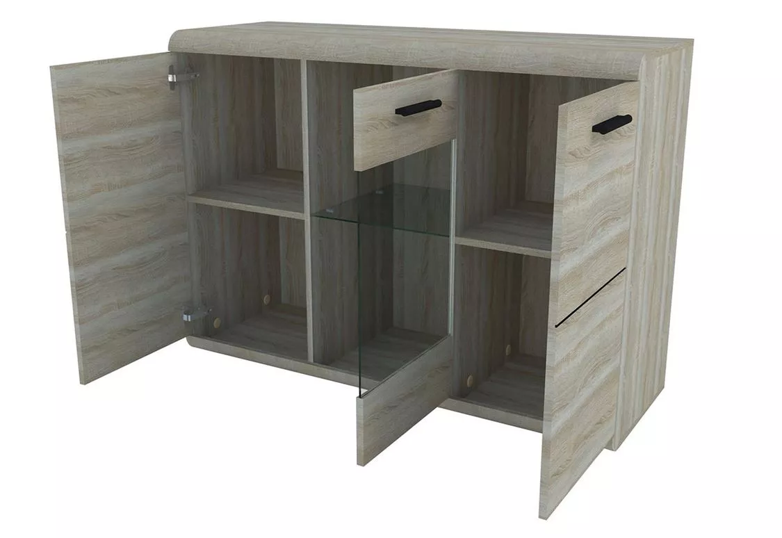 A praktikus Claudio fiókos szekrény bármilyen modern enteriőrben megtalálja a helyét. A tágas szekrényekben könnyedén tárolhat bármilyen tárgyat, beleértve az ünnepi edényeket, asztalterítőket és különleges alkalmakkor használt evőeszközöket. Az üveg rész a kedvenc tárgyai bemutatására szolgál. A könnyű hozzáférés megkönnyíti a mindennapi használatot és rendben tartja azokat. A fiókos szekrény praktikus LED világítással van felszerelve.