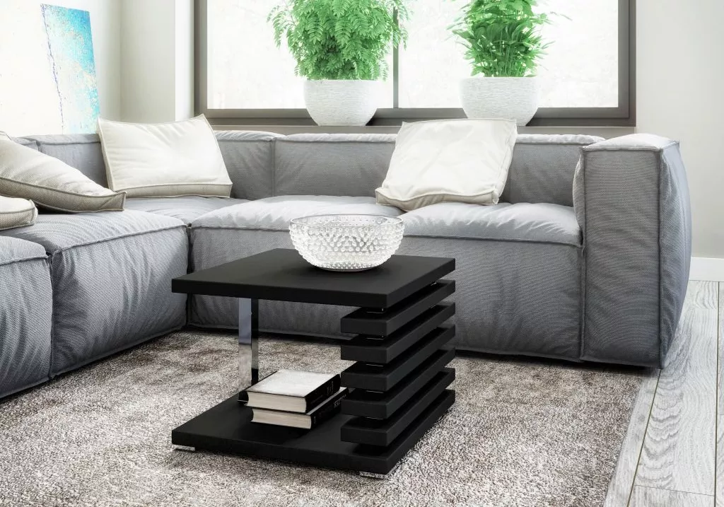 A CELAENA dohányzóasztal különleges külsővel rendelkezik, az egyik oldalán átlapolt táblák a másik oldalán fém láb található. Kiváló minőségű laminált lapokból készült,a melyek sima felülettel rendelkeznek és könnyen tisztíthatóak. A bútorok szélei PVC élzárókkal vannak ellátva.
