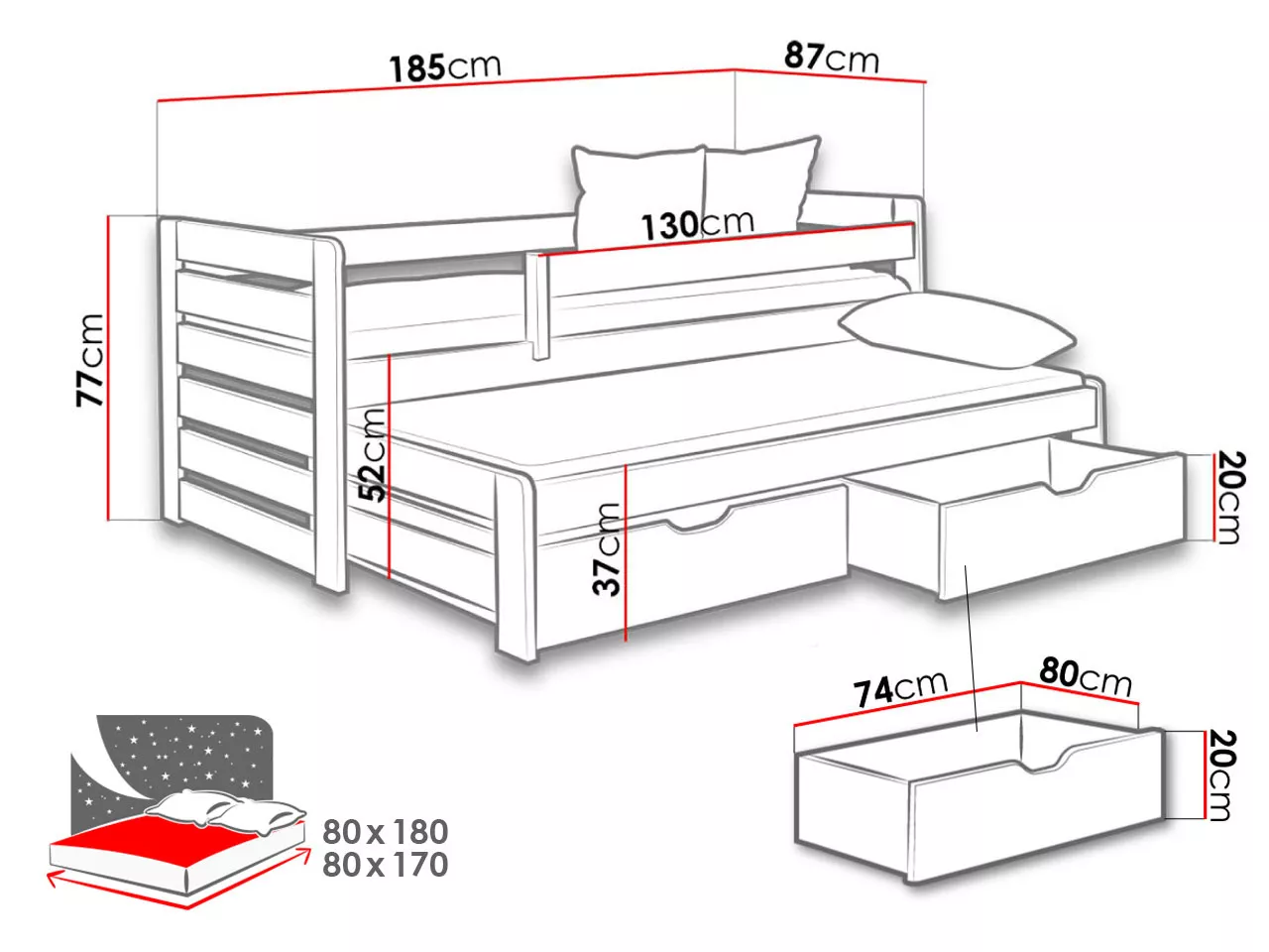 - pótágy: 87/37/175; hálórész: 80x170 cm