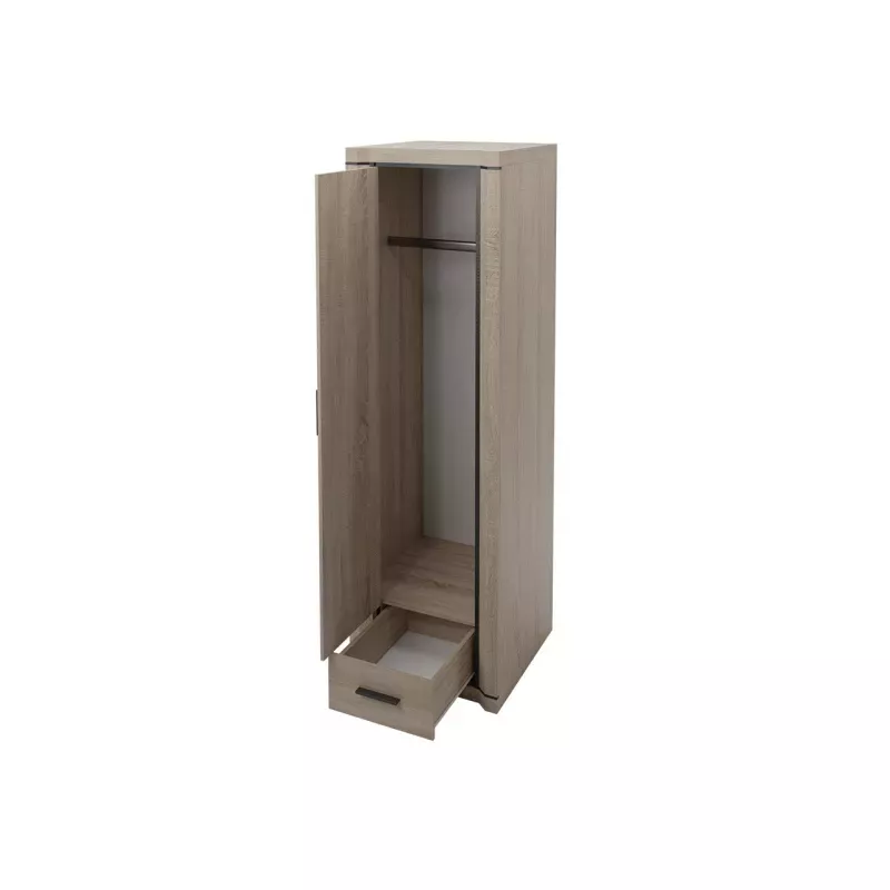Az AIRA gardróbszekrény bármelyik hálószoba vagy előszoba kiegészítője lehet. A gardróbszekrény egy vállfával és egy fiókkal van felszerelve, amely az alsó részen található. A kiváló minőségű alkatrészek biztosítják a gardróbszekrény stabilitását és tartósságát.