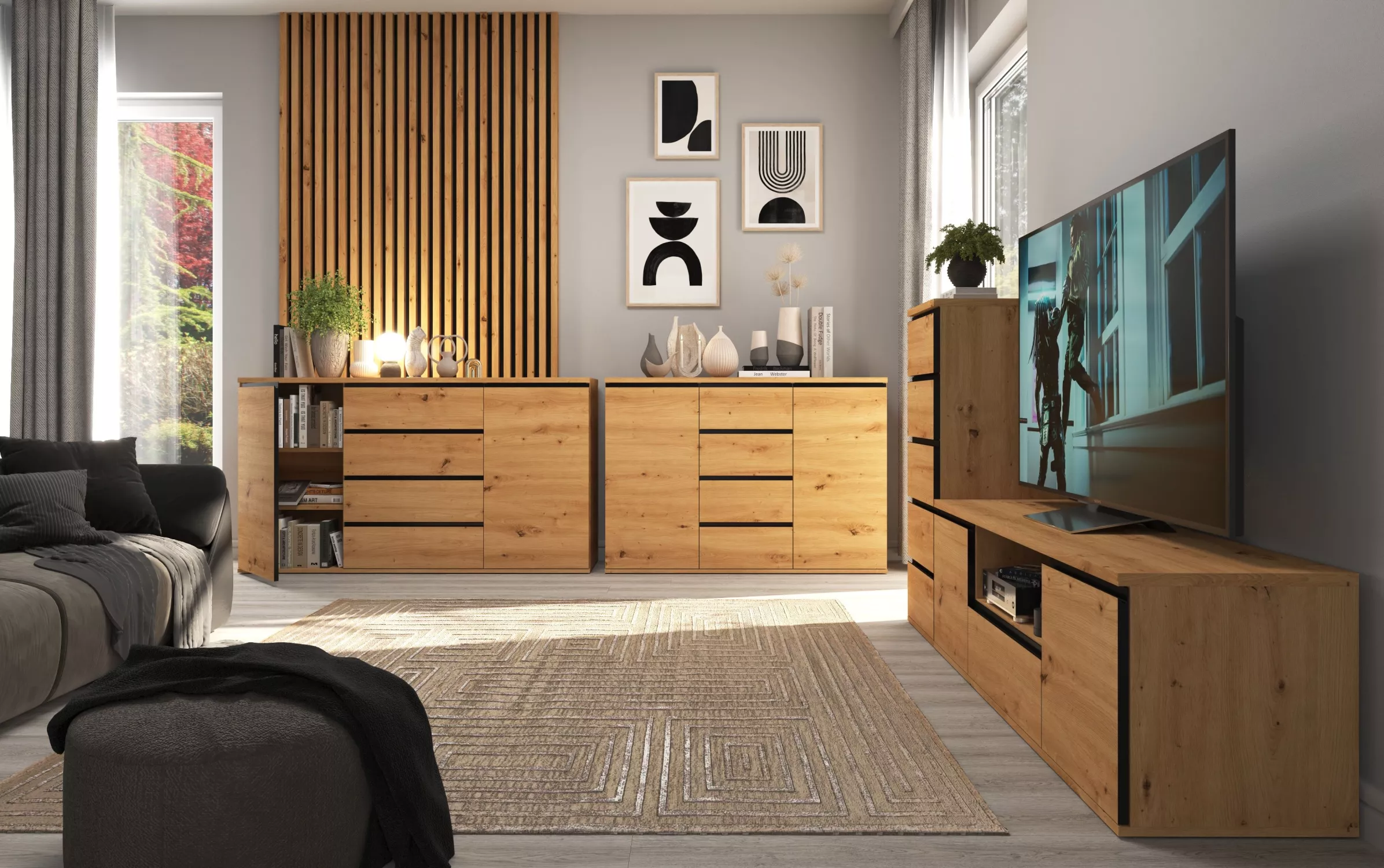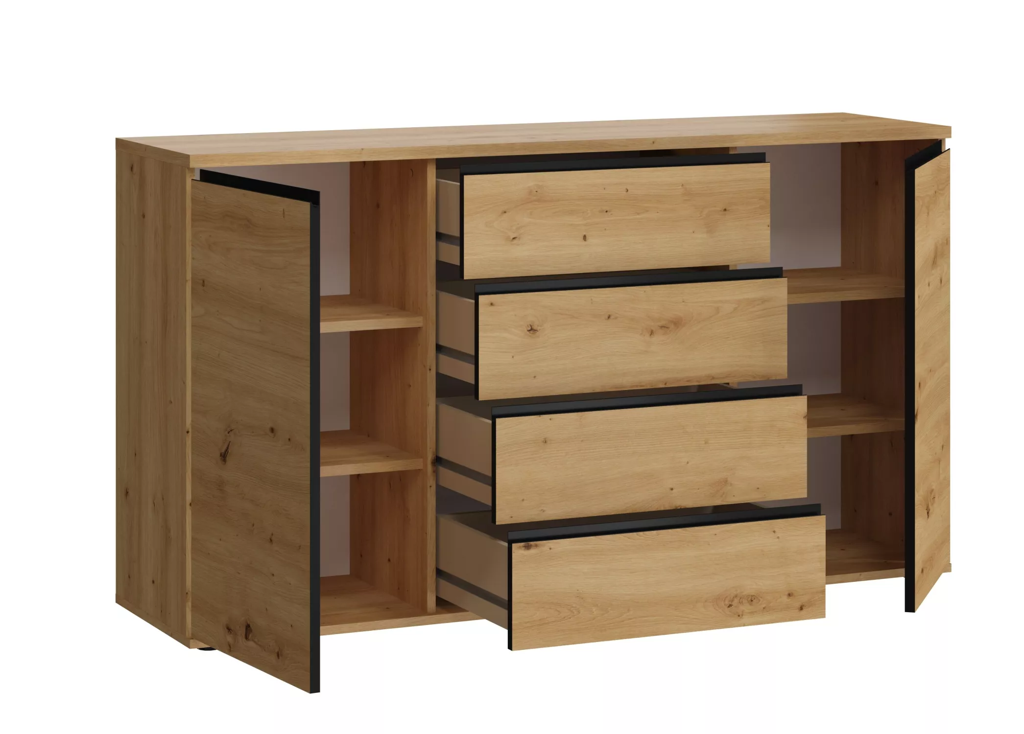 A széles HERA komód tökéletesen illeszkedik egy modern belső térbe. A meleg faárnyalatok és a fekete szín elemeinek kombinációja dizájner jelleget kölcsönöz a belső térnek. A komód 4 fiókkal és polcos oldalsó szekrényekkel rendelkezik.