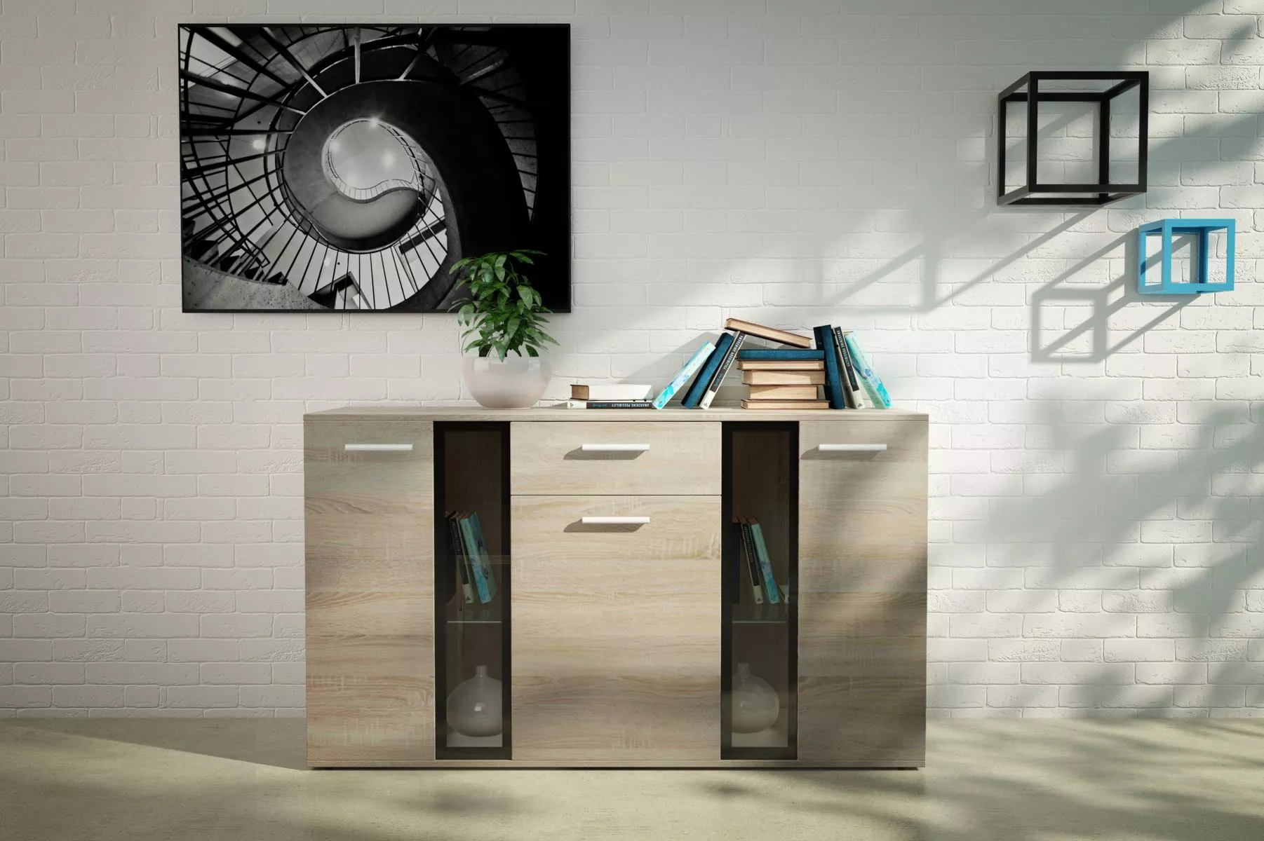 A Sana stílusos komód bármilyen helyiség dísze lesz. A megnyerő megjelenésén kívül értékeli majd az elegendő tárolóhelyet, míg az üvegezett részben kiállíthatja a dekortárgyait. A komód laminált bútorlapból készült, ami ellenálló anyagáról híres.