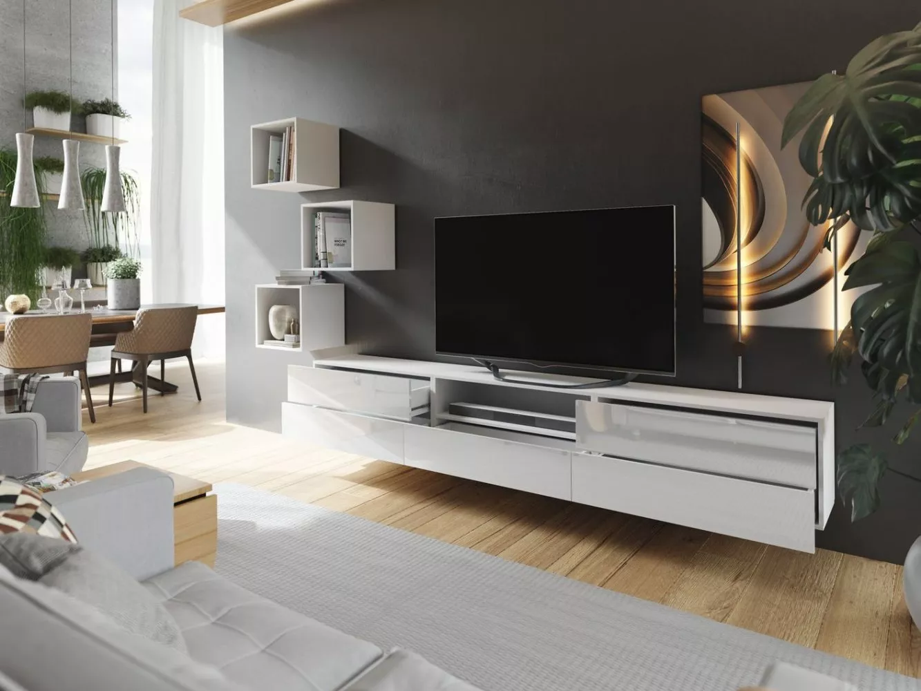 A nappali bútorok Bradt 56 készlete remekül kiegészíti a modern belső teret. A nappali szekrénysor nem rendelkezik hagyományos fogantyúkkal, ezeket a PUSH TO OPEN rendszer váltotta fel. A szekrényeket a falra akaszthatja, vagy rendelhet lábakat és elhelyezheti őket a padlón.