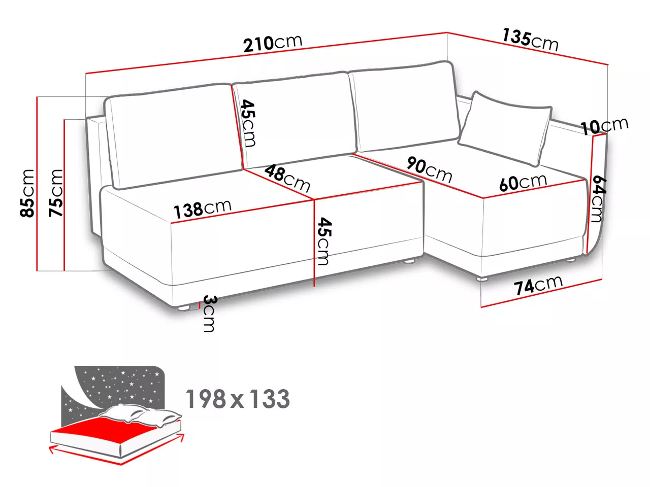 - fekvőfelület: 133x198 cm