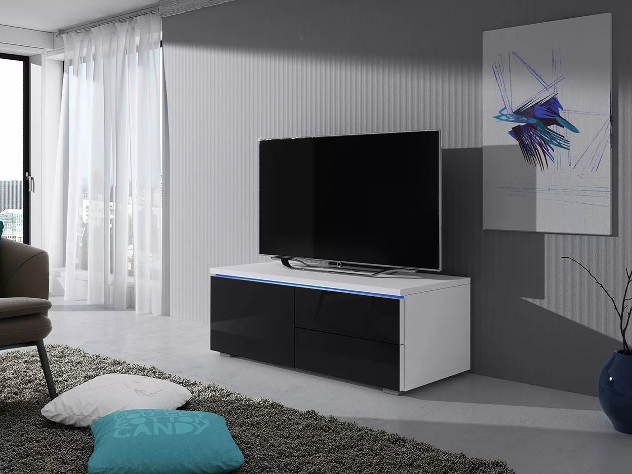 A TV-asztal kék LED világítással van felszerelve, amely modern jelleget kölcsönöz a belső térnek.