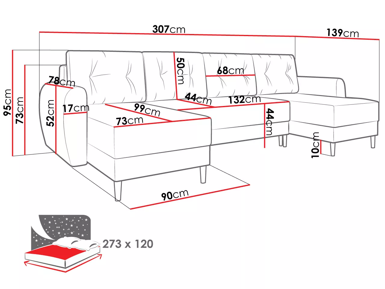 - ágyfelület: 120x273 cm